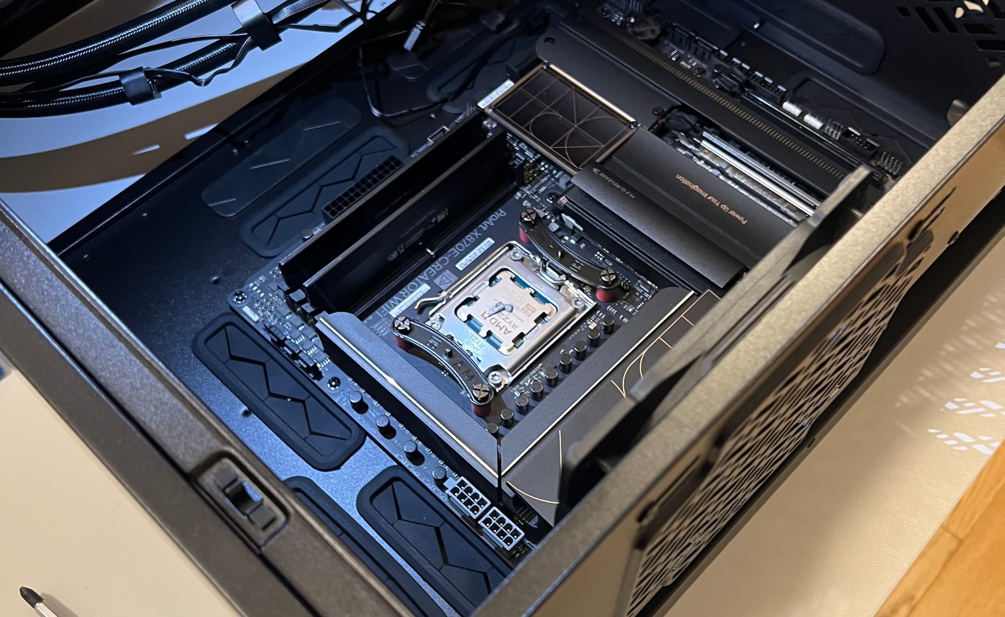 My choice was the Asus ProArt X870E-CREATOR WIFI: it comes with built-in 10 Gb ethernet, a very nice and full-featured UEFI firmware, extensive IO capabilities (including USB 4.0) and an IOMMU configuration very amenable to my intended setup.