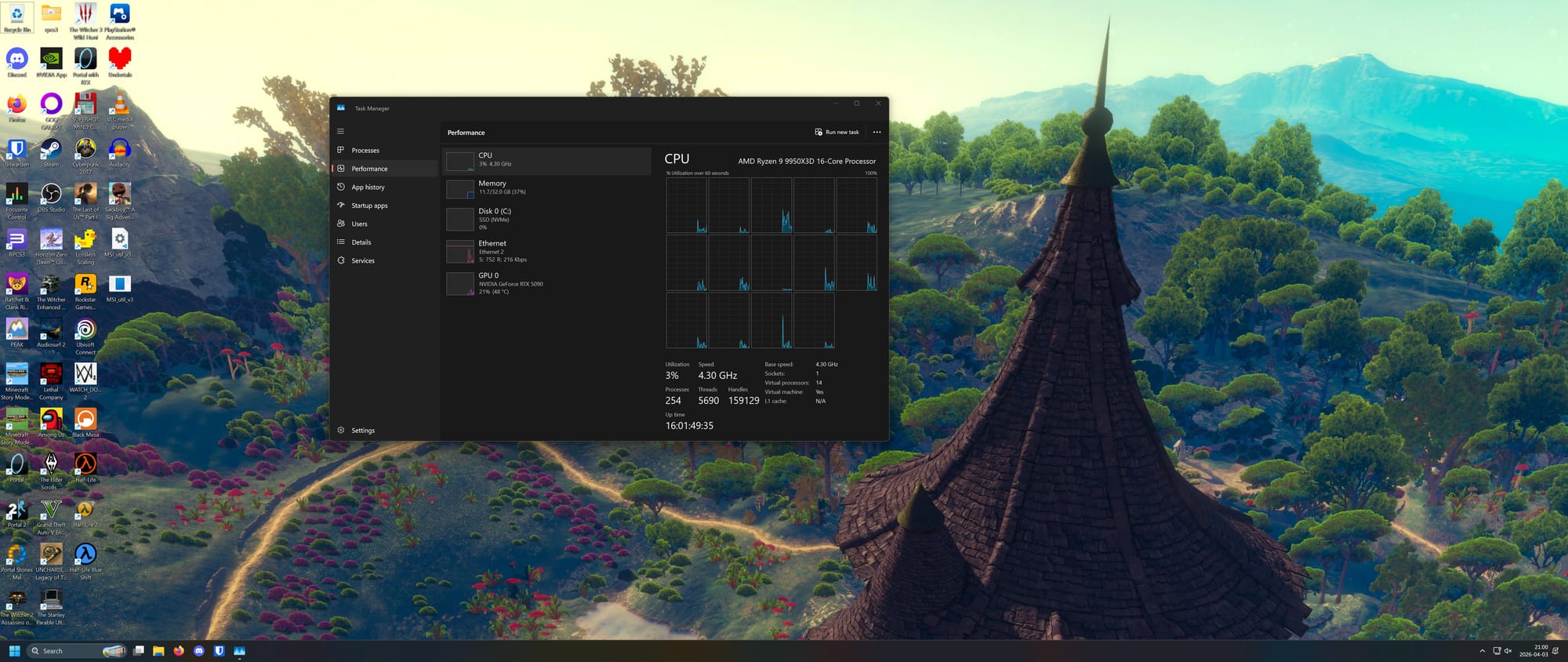 Performance in games, after all the tuning, is pretty close to native. I won't go into detail as this isn't a benchmark article (and admittedly, I haven't booted into a native OS to test in a while) but as an example I get around 97% constant GPU utilization in The Witcher 3: Wild Hunt and have had no jitter in various other AAA titles, which is good enough for me. An early Cyberpunk 2077 test comparison between native and virtualized (prior to applying many of the optimizations described above) shows a ~8% slowdown, but I'd have to repeat this experiment now for it to be representative.