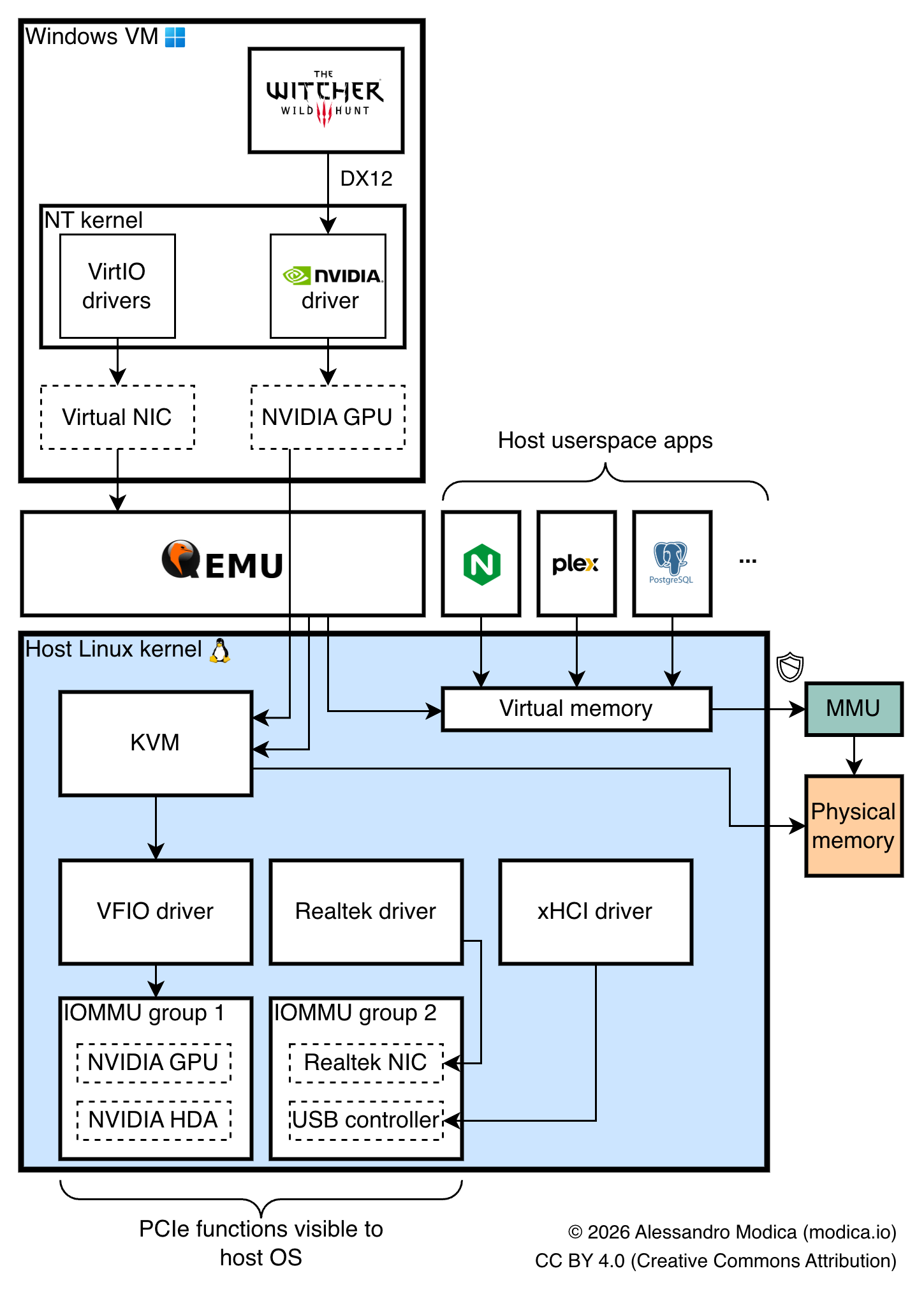 VFIO heavily leverages IOMMU, a PCIe feature which maps virtual address spaces for each PCIe device onto regions of your host's memory space, much like your OS and MMUs map different processes' virtual memory onto physical memory. This enables physical devices to be mapped to the memory spaces of entirely different guest OS's, provided that the IOMMU topology of your system is granular enough, as we'll see later.