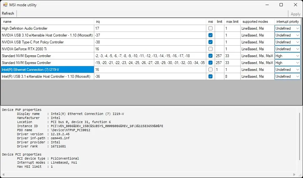 - To get better I/O performance and reduce jitter (particularly with HD Audio devices) make sure to enable MSI interrupts instead of Line-Based for devices that support them. This requires editing the Windows Registry, but it can be trivially done with the MSI Utility v3 from the Guru3d forums, or the fancier GoInterruptPolicy tool from GitHub; please read the corresponding documentation before using these tools