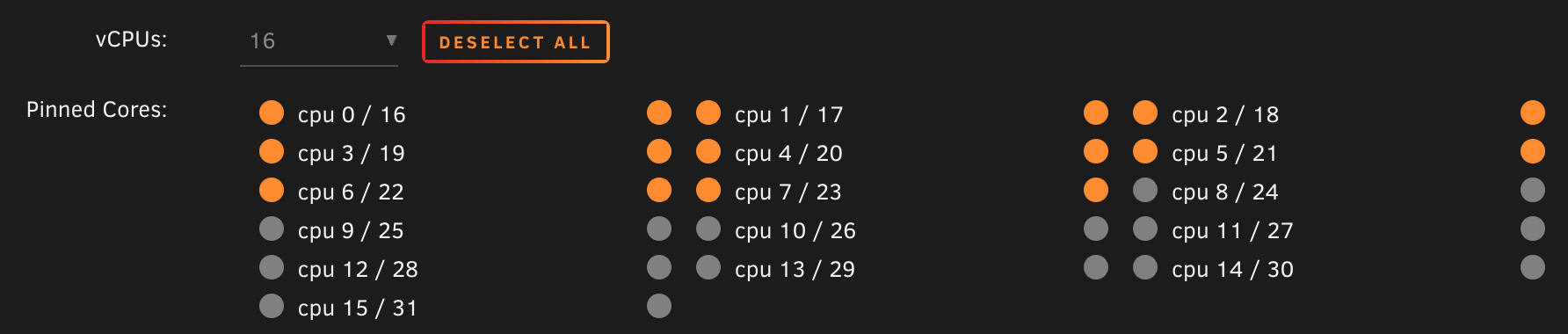<vcpupin vcpu='3' cpuset='18'/>